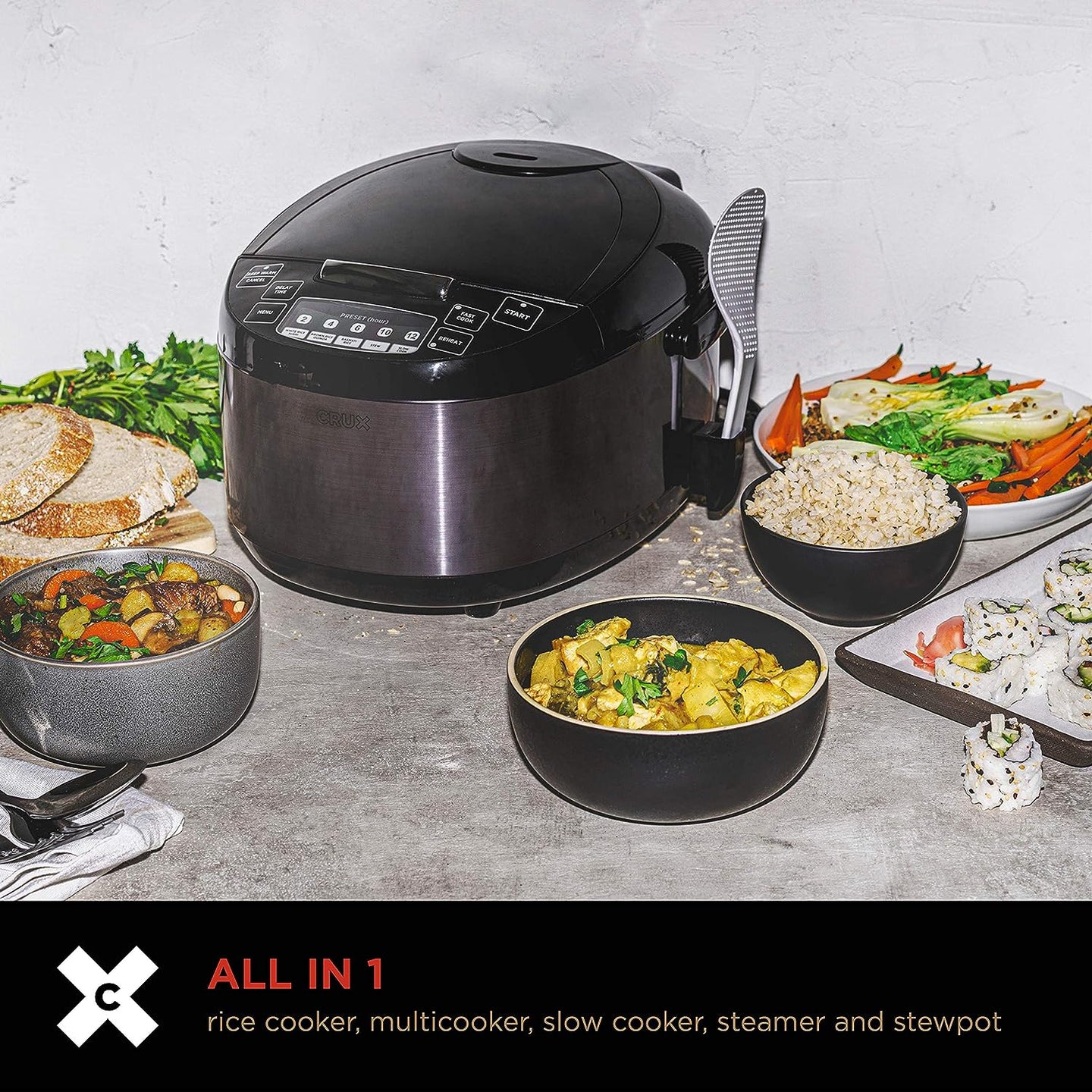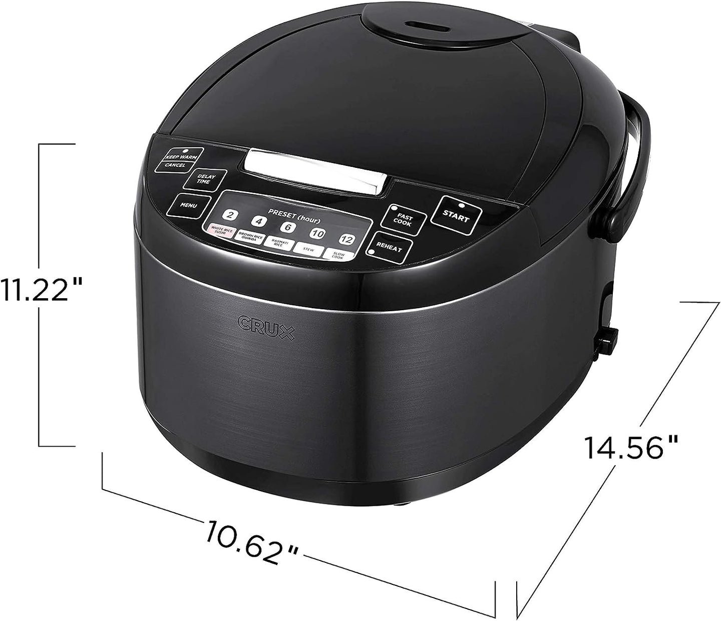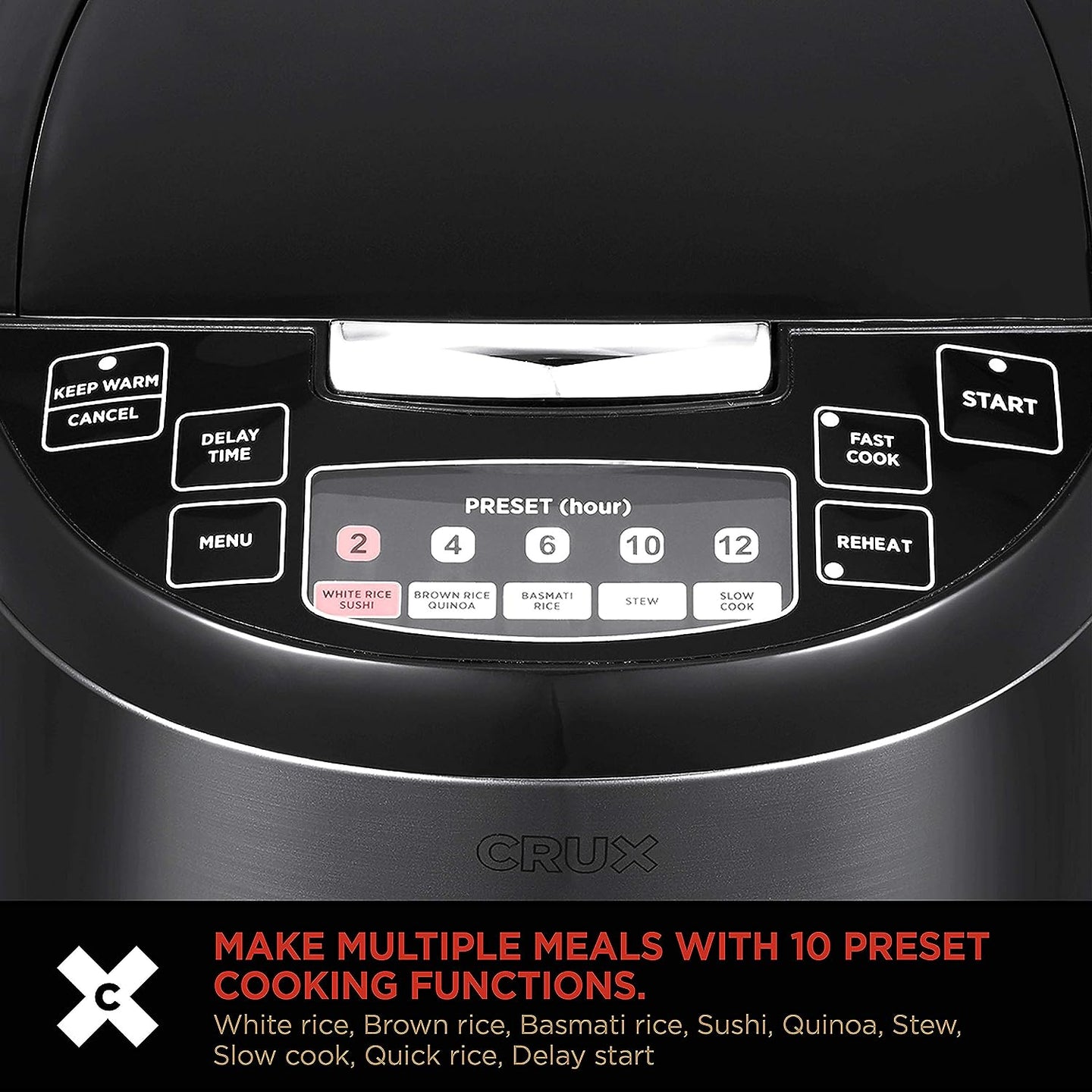 Cook for the crowd! The powerful 1200 watt heating system can make up to 20 Cups of Rice with the Crux 20 Cup Rice Cooker, perfect for entertaining and large families. Sleek LCD display with 12 preset functions allow you to make fluffy rice, slow cook, steam, make stews, simmers, cook oatmeal, and pasta. It also makes home made yogurt at the touch of a button. Organize your busy lifestyle with the help of our programmable delayed start time up to 24h in advance. The water level detector self adjusts to keep warm once your meal is ready to prevent burning. Cook rice proteins while steaming fish or veggies, offering an ideal one-pot solution for dinners. Tired of clean up? The dishwasher safe cooking bowl, steam tray, rice paddle, and rice measuring cup make clean up easy. Cook like you mean it with the Crux 20 Cup Rice cooker.