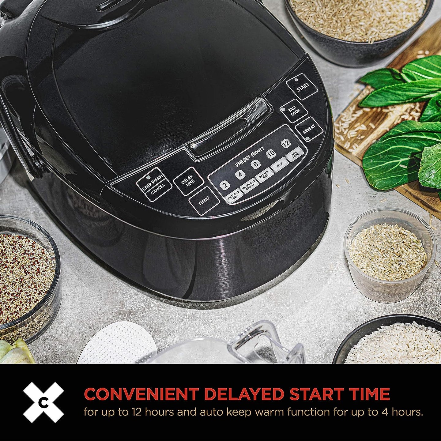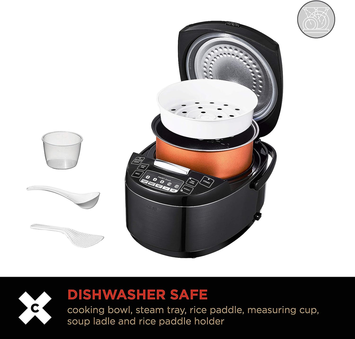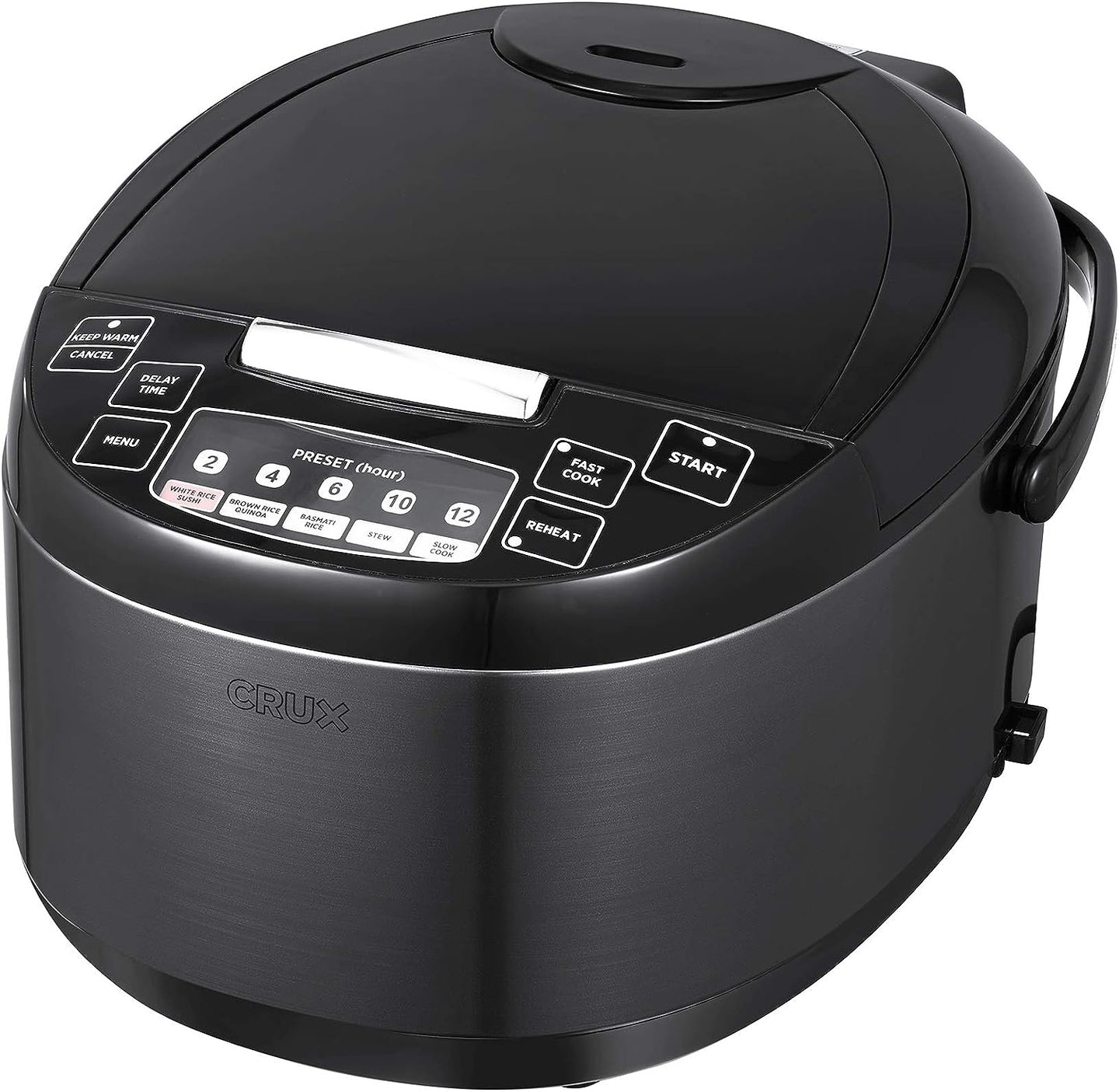 Cook for the crowd! The powerful 1200 watt heating system can make up to 20 Cups of Rice with the Crux 20 Cup Rice Cooker, perfect for entertaining and large families. Sleek LCD display with 12 preset functions allow you to make fluffy rice, slow cook, steam, make stews, simmers, cook oatmeal, and pasta. It also makes home made yogurt at the touch of a button. Organize your busy lifestyle with the help of our programmable delayed start time up to 24h in advance. The water level detector self adjusts to keep warm once your meal is ready to prevent burning. Cook rice proteins while steaming fish or veggies, offering an ideal one-pot solution for dinners. Tired of clean up? The dishwasher safe cooking bowl, steam tray, rice paddle, and rice measuring cup make clean up easy. Cook like you mean it with the Crux 20 Cup Rice cooker.