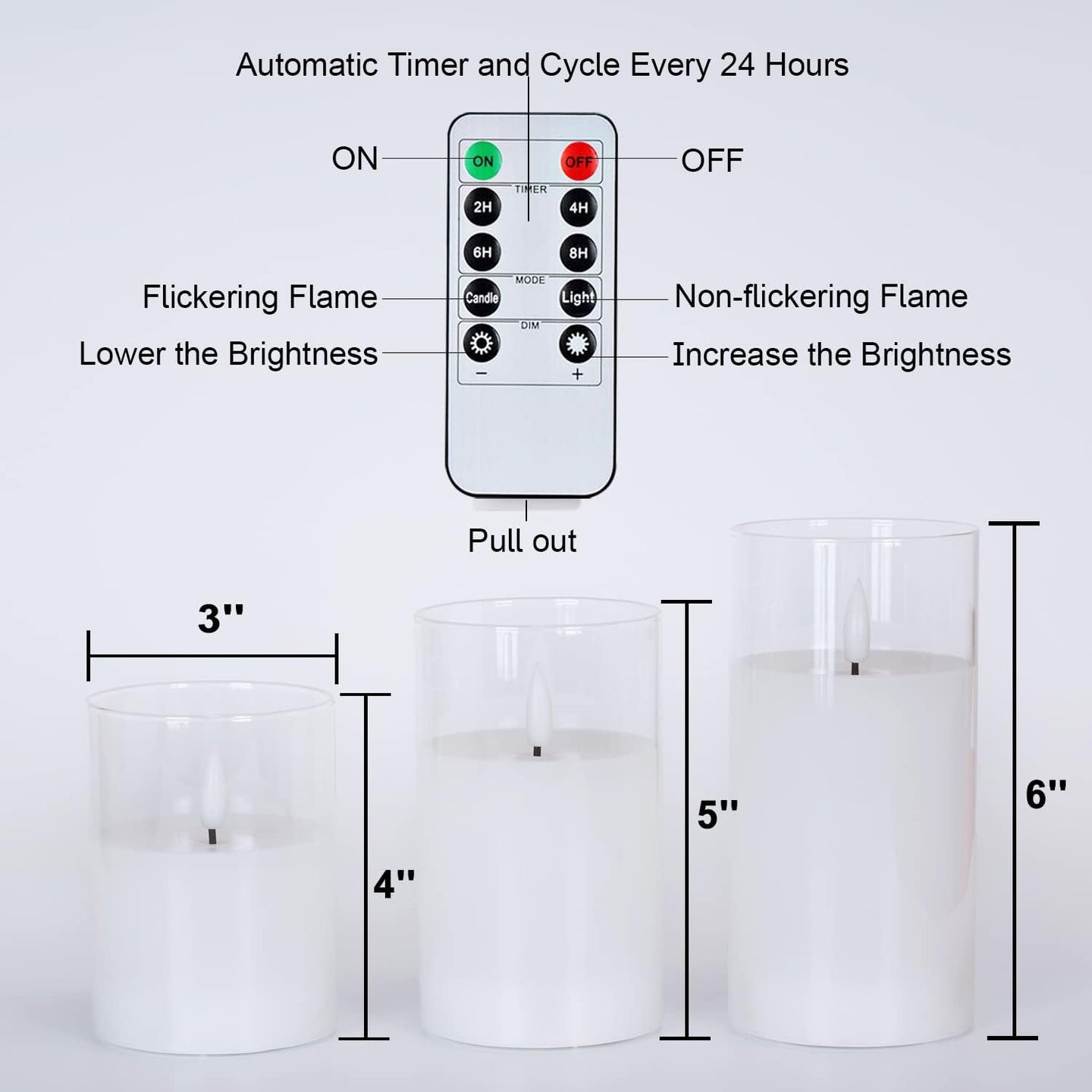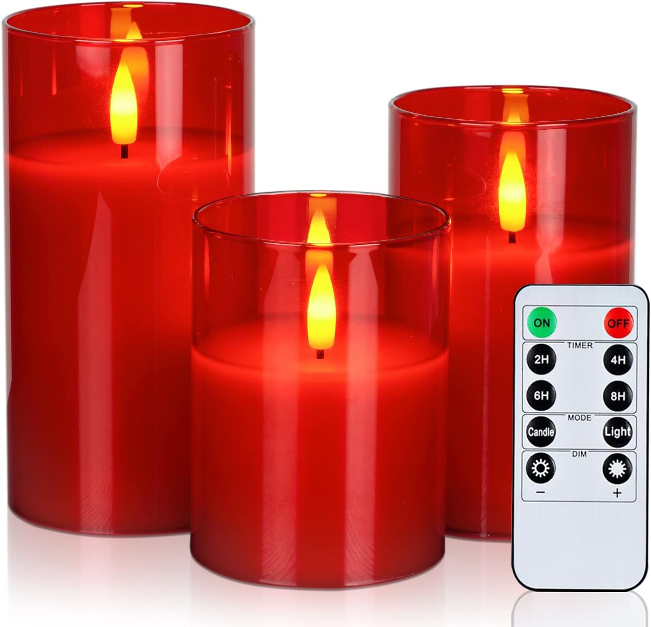 - Package Include: This glass candle set includes three flameless pillar candles(D3”x H4”5”6”), a 10-key remote control, one user manual. Each battery candle powered by 2 x AA batteries (not included) which can live up to 500+ hours.